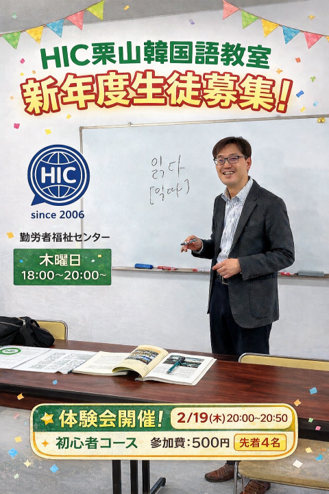 栗山教室 韓国語入門クラス 体験会開催! 韓国語を一からスタートする方対象のクラスです! ※その他のレベルの方はお問合せ下さい。 通常クラスは月3回木曜日20:00-20:50となります。 お月謝:8250円+税